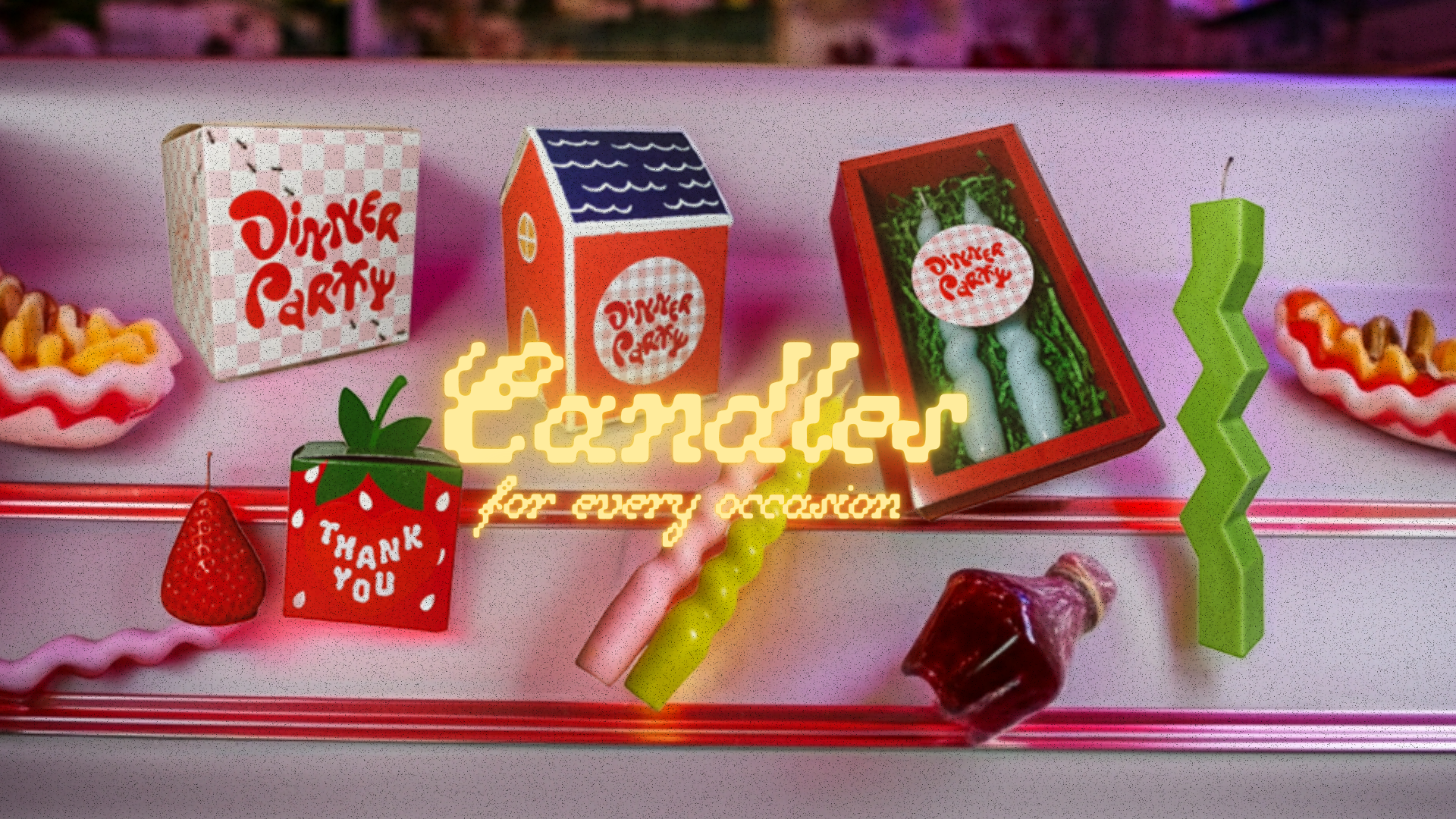 Dinner Party Candle Co serves up fun, cool, and unexpectedly bold novelty candles! From realistic food forms to elegant abstract tapers, our goal is to provide a unique, fun, and uncommon candle experience made for any occasion!